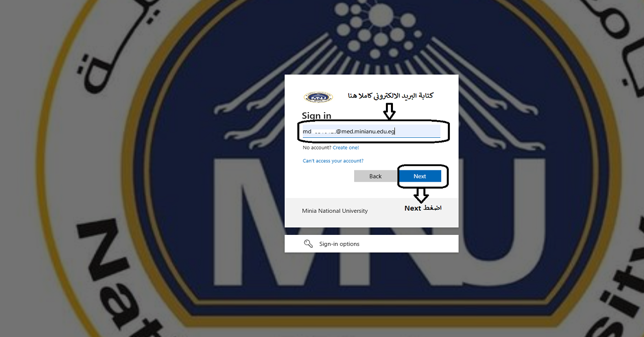 في الشاشة الموضحة قم بادخال البريد الالكتروني كاملا كما موضح علي الكارنيه. Next ثم اضغط